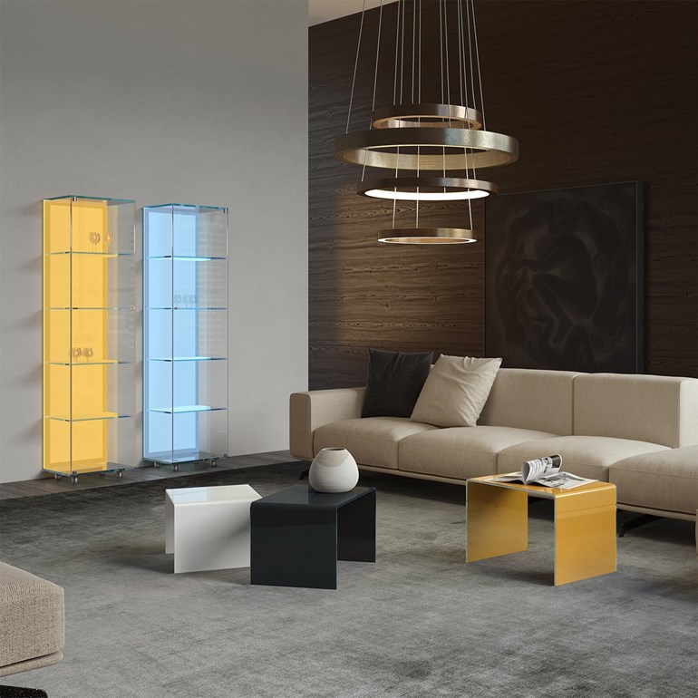 (Foto zeigt Satztische ST06 in farbiger Ausführung und Glasvitrinen SOLUS BACKLIGHT)