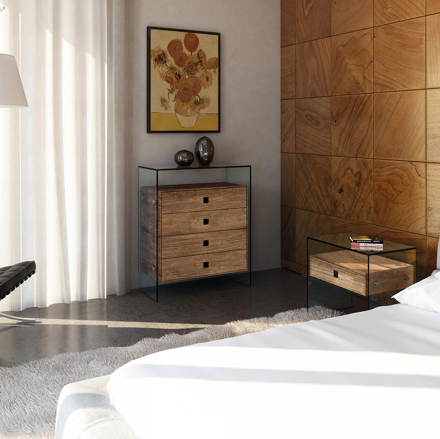 Bedside table PURE WOOD: A compelling combination of high-quality materials. Integrated into the mitred glass corpus is a compartment made of massive natural wood. You can choose from oak, walnut or vintage look. This unique look is achieved by an extensive workmanship where the wood is chipped in a special procedure in irregular intervals, making every chest of drawers one of a kind with an appearance of matured wood.The massively mortised wood compartment is equipped with a central embedded glasselement lacquered in your favourite color as a pressure point for opening the compartment which is equipped with a „push-to-open“ function.